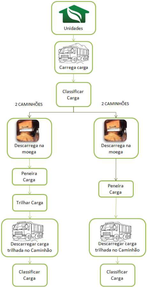 O teste de impureza apresentado na Figura 13 consiste em classificar a soja vinda de unidades operacionais, e descarregar 2 cargas na moega do graneleiro, depois esta carga é puxada no processo, passa pelas peneiras e, em seguida, é descarregada em outro caminhão, e passa por nova classificação. O mesmo procedimento será realinhado para outras duas cargas, mas após passar pelas peneiras também passará pela trilhadeira. Este é um teste que foi planejado, todavia ainda não foi executado. A concretização deste teste tem como objetivo analisar a influência da trilhadeira no processo produtivo, bem como a ocorrência de quebra técnica neste intervalo.