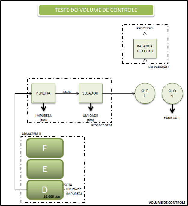 Além de todos os testes realizados e que estão para serem concretizados, foi planejado o Teste de Volume de Controle que consiste em simular um corte do processo como um todo, desde a classificação até entrada da soja para esmagamento na fábrica, denominado como corte da célula “D”, este está ilustrado na Figura 14.