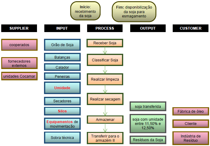 Por meio da Figura 1, é possível observar a estrutura macro do processo de transferência onde foram identificadas as principais etapas do processo, que são: recebimento, classificação, limpeza, secagem, armazenamento e transferência. Além disso, foi possível observar quais são os inputs do processo, seus fornecedores, os outputs e os clientes finais. Com isso, a ferramenta SIPOC auxilia a contextualizar o processo como um todo.