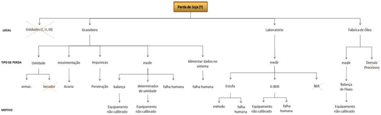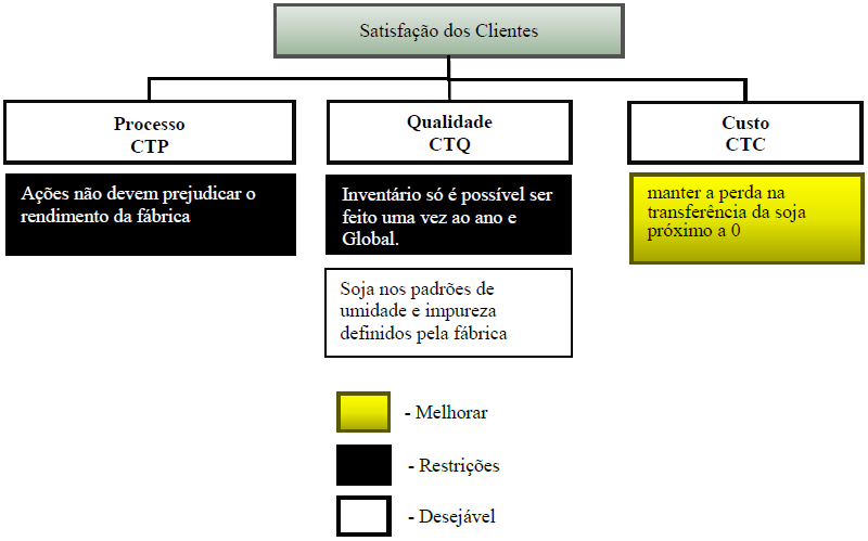 Com a realização da árvore de requerimentos (Figura 2), foram analisadas duas restrições importantes do processo: uma delas está nas ações de melhorias ou testes do projeto que não poderiam prejudicar o rendimento da fábrica, ou seja, estas ações não poderiam comprometer o processo de esmagamento do grão, não ocorrendo falta do produto, ou produto fora do padrão; a outra restrição é o fato do fechamento Global da empresa ser realizado apenas uma vez ao ano, assim, não era possível a análise constante dos dados de fechamento. O ponto de melhoria apontado está em garantir que no processo de transferência da soja entre graneleiro e fábrica fossem evitadas as perdas, aproximando este valor a 0%.