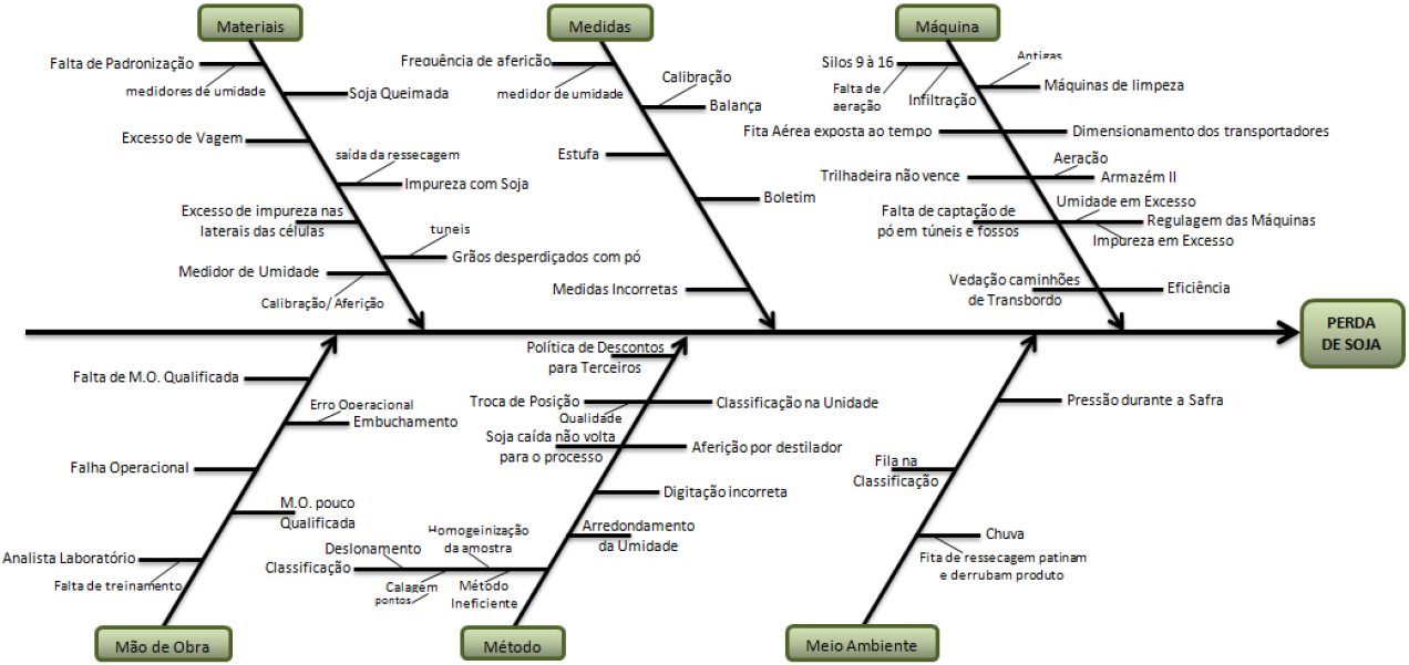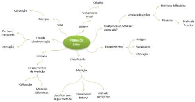 Como próximo passo para esta frente do projeto, está sendo programado novo teste para validar a calibração. Após a calibração da balança, foi realizado o diagrama de Ishikawa, apresentado na Figura 8, através de uma reunião com a equipe do projeto juntamente com os especialistas. Nesta etapa, o intuito era levantar todas as possíveis causas para a perda de soja durante a sua transferência.
