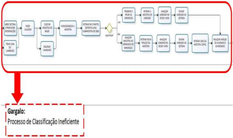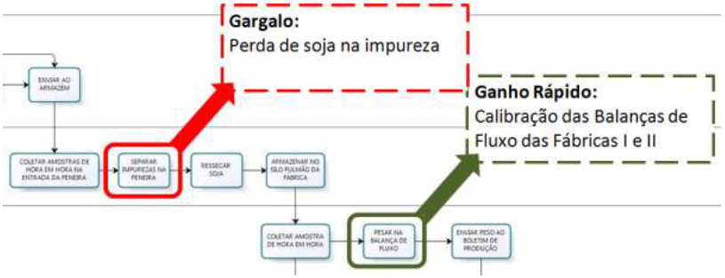 Dentro da etapa medir (measure), foi realizado o mapeamento do processo, apresentado no Apêndice A, sendo esta uma etapa importante, pois após a sua construção foi possível analisar os principais gargalos que deveriam ser melhorados, identificados na Figura 5 e na Figura 6. Além disso, também foi verificado um ponto de ganho rápido do projeto apontado na Figura 6: a calibração das balanças de fluxo das fábricas I e II, garantindo assim, a conformidade do peso de soja.