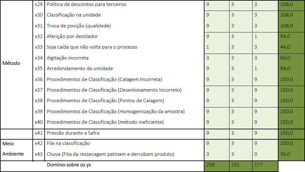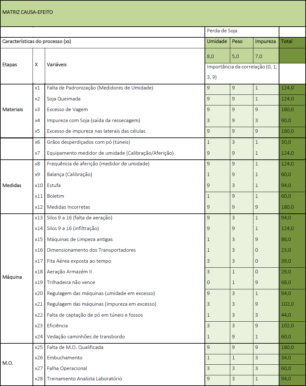 Para realização da matriz causa-efeito, reuniu-se a equipe e os especialistas, e o primeiro passo foi definir os “Y” que seriam trabalhados, aqueles que influenciam diretamente na perda, e foi determinado que fossem, especificamente, Umidade, Peso e Impureza. Posteriormente, foram atribuídos a cada uma das frentes, pesos que determinassem a interferência de cada frente em relação ao “Y” principal, que é a perda de soja. Foi estipulado que, para “umidade” foi utilizado peso 8,0, para frente “peso” 5,0 e para “impureza” 7,0.