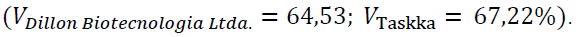 A empresa de base tecnológica Taskka considera o nível de receptividade do ambiente de trabalho a novas sugestões moderado, assim como classifica baixa a identificação dos funcionários com a empresa. Ainda, não usa ferramentas que possibilitam transferência e acessibilidade ao conhecimento dos colaboradores, não trabalha em prol da marca da empresa e não investe em novos mercados, o que justifica a classificação da empresa em potencialmente competitiva. No que diz respeito a Dillon Biotecnologia Ltda., a organização considera moderados o nível de eficácia das ferramentas de comunicação utilizadas entre os funcionários da empresa e o nível de identificação dos clientes com produtos e serviços. Além disso, não apresenta profissionais especializados em gestão de projetos e pesquisa, desenvolvimento e inovação, fatores apontados como tendências fortes para o setor.