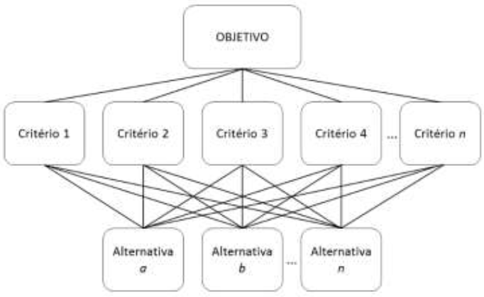 Dentre os métodos de abordagem multicritério existentes, Zhü (2014) sugere que o método Analytic Hierarchy Process (AHP) tem sido uma ferramenta adequada para mensurar intangíveis, lado a lado com os tangíveis, e amplamente utilizado na tomada de decisões como uma forma de definição de prioridades. O método AHP é utilizado para apoio à decisão multicritério com base em uma decomposição hierárquica de um problema de decisão em vários critérios, na avaliação das preferências, usando comparações de pares, e em uma agregação dessas preferências de pares em uma avaliação global das alternativas (Durbach, Lahdelma, & Salminen, 2014). Como é possível perceber na Figura 1, a hierarquia é composta por três níveis principais: objetivos, critérios e alternativas.