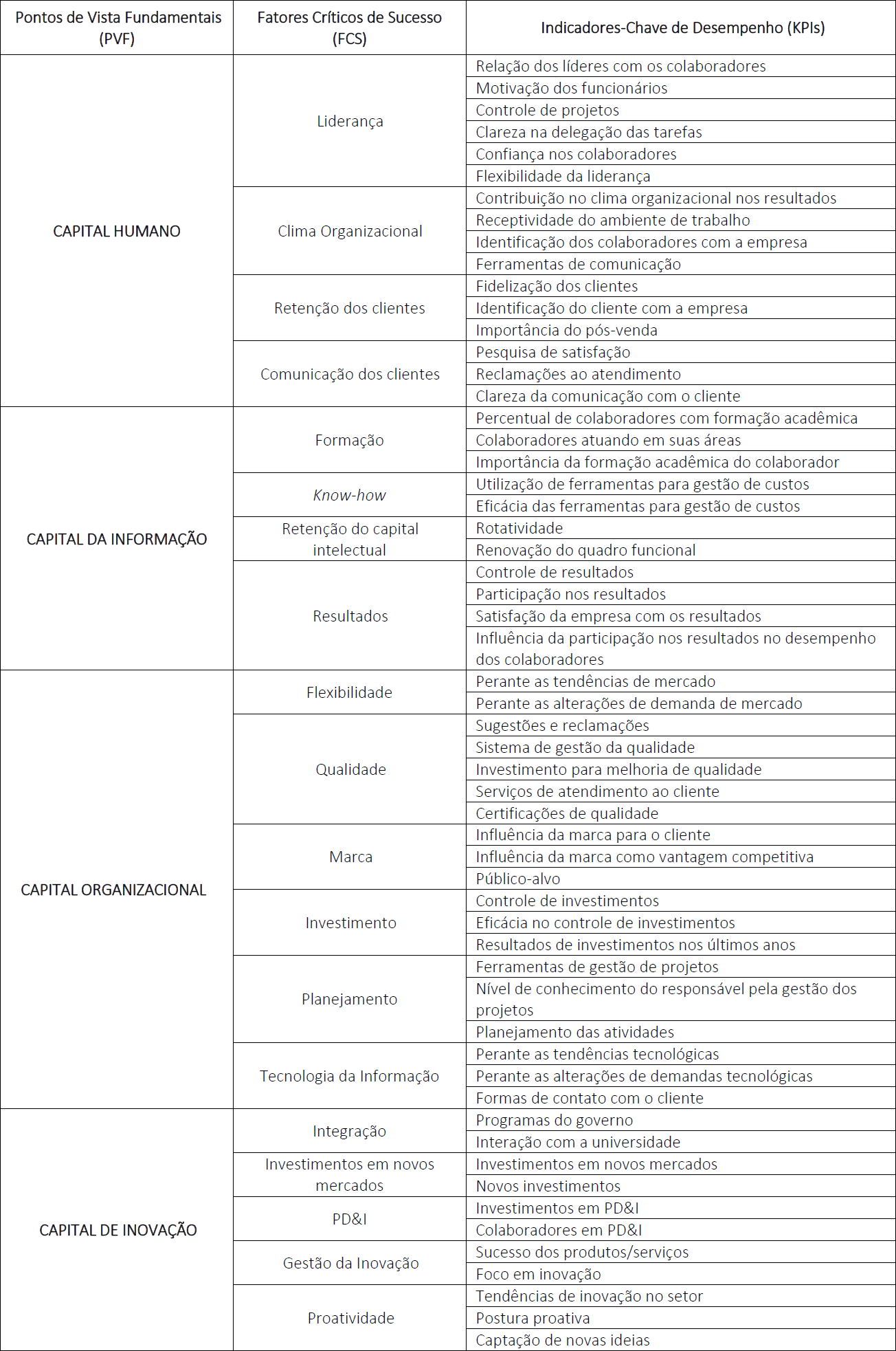 A etapa que contempla o levantamento dos indicadores foi realizada com base na ferramenta desenvolvida pelo Núcleo de Inovação e Competitividade/NIC-UFSM para mensuração da competitividade a partir do desdobramento do objetivo central em Pontos de Vista Fundamentais (PVF) e Fatores Críticos de Sucesso (FCS) (Marques, Siluk, Neuenfeldt, & Cattelan, 2014).