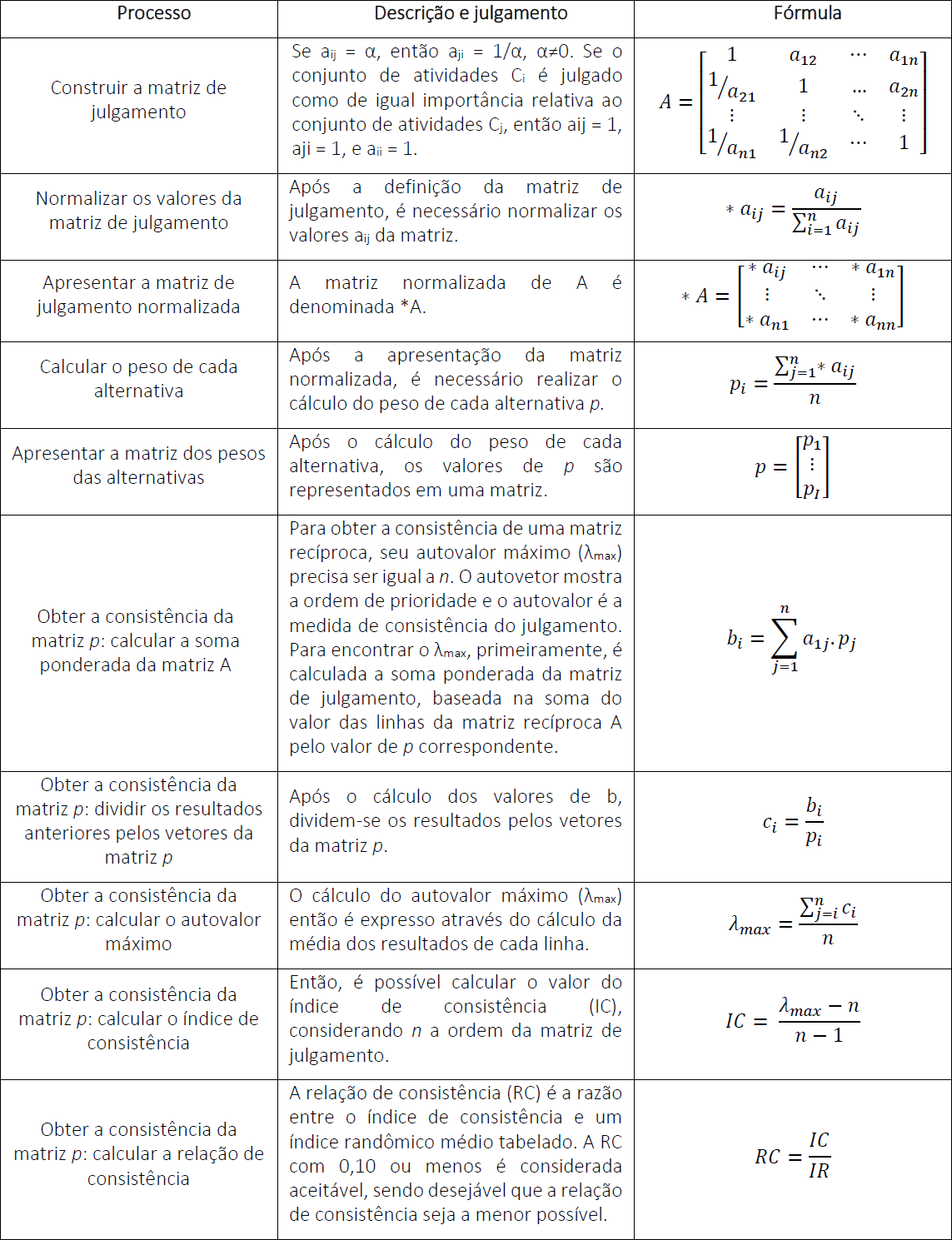 Após o levantamento dos valores referentes ao grau de importância dos elementos, é construída uma matriz quadrada de julgamento “A”, que é apresentada no Quadro 2, juntamente com todo o processo matemático que envolve o método AHP.