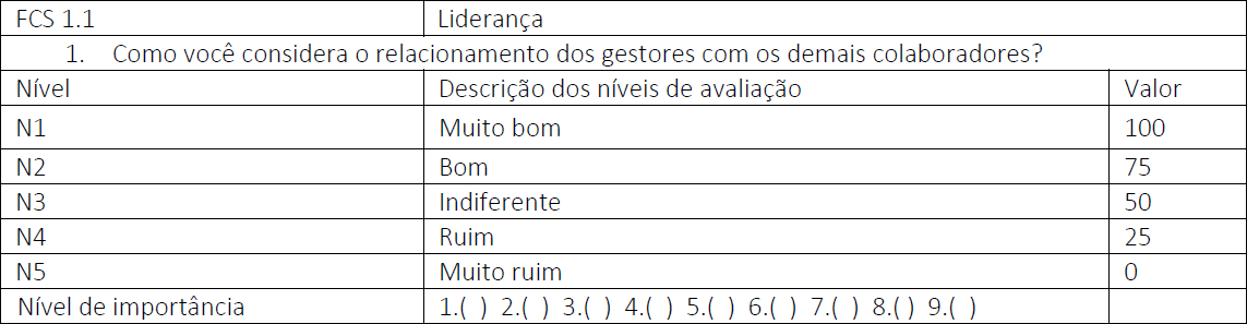 O Quadro 3 apresenta um exemplo da estrutura do instrumento para os indicadores agrupados no FCS 1.1 e pertencentes ao Ponto de Vista Fundamental 1 (Capital Humano). Todos os indicadores são compostos pelo número de localização da sua posição na árvore de decisão, nome do indicador, níveis de avaliação, descrição das alternativas e valor de cada nível em porcentagem. A lógica é a mesma para todos os 57 indicadores da árvore de decisão, totalizando um instrumento com 57 perguntas.
