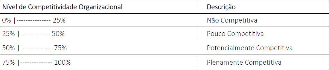 Com o objetivo de avaliar o nível total da competitividade em EBTs, ao final da aplicação do instrumento foi possível enquadrar a empresa respondente em um dos quatro níveis de competitividade organizacional, conforme o Quadro 4.