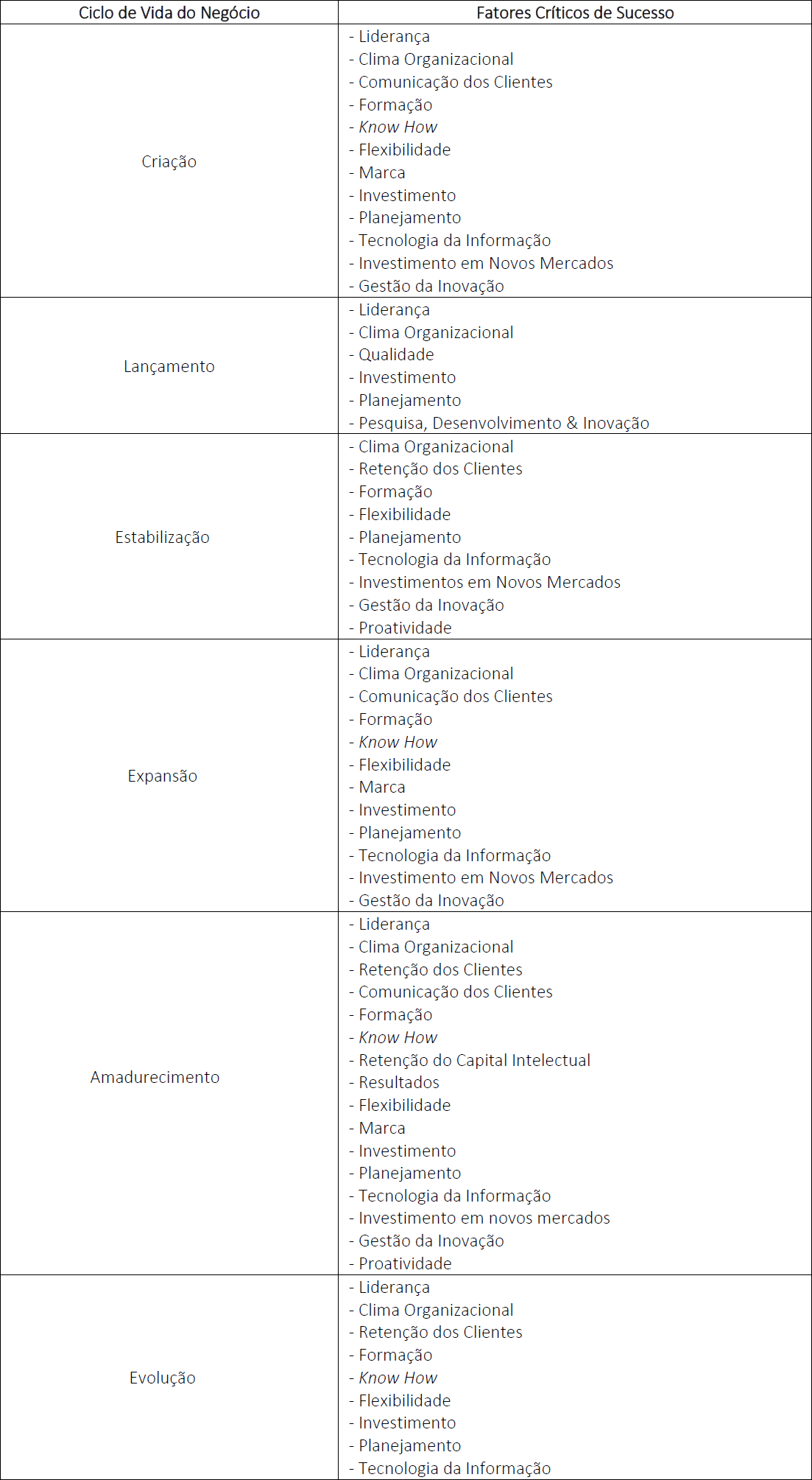 a métrica utilizada para realizar a seleção dos critérios permitiu visualizar como cada FCS influencia em cada fase do ciclo de vida do negócio. Tem-se como exemplo a fase de estabilização, em que as empresas acreditam ser necessária a proatividade para investir em novos mercados e focar em inovação para consequentemente expandir o negócio;