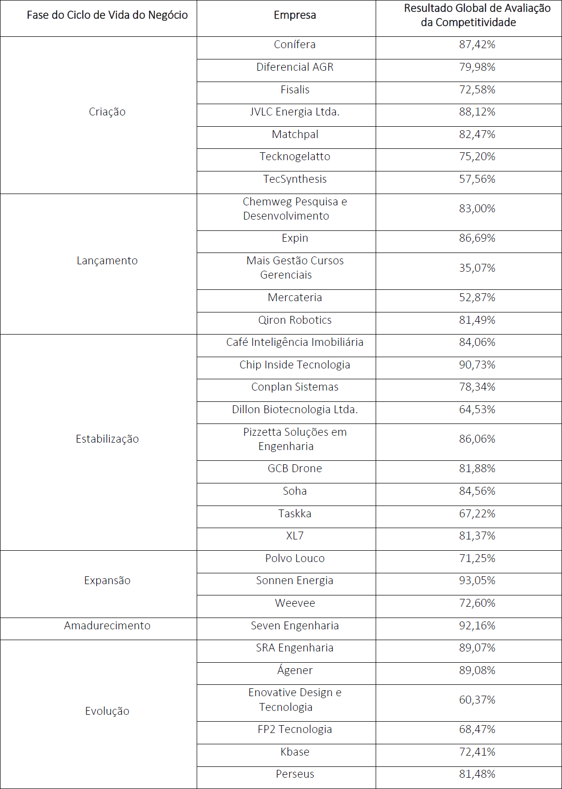 o teste da modelagem em 31 empresas de base tecnológica foi capaz de demonstrar a situação competitiva destas empresas em cada fase do ciclo de vida. Os resultados observados em cada etapa apresentam alguns entraves competitivos, como é o caso da fase de expansão, em que se encontram quatro empresas que não são plenamente competitivas, pois algumas não aplicam ferramentas de know-how e não reagem às tendências do mercado;