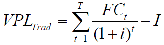 Desta forma, a partir do fluxo de caixa futuro e da taxa de desconto ajustada ao risco, foi calculado o valor presente líquido sem flexibilidade ou valor presente líquido proveniente do método tradicional (VPLTrad), por meio da Equação 2.