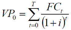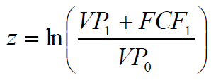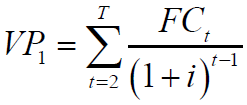 O valor presente do projeto no instante t = 0 e t = 1 foram calculados, concomitantemente, conforme as Equações 5 e 6.