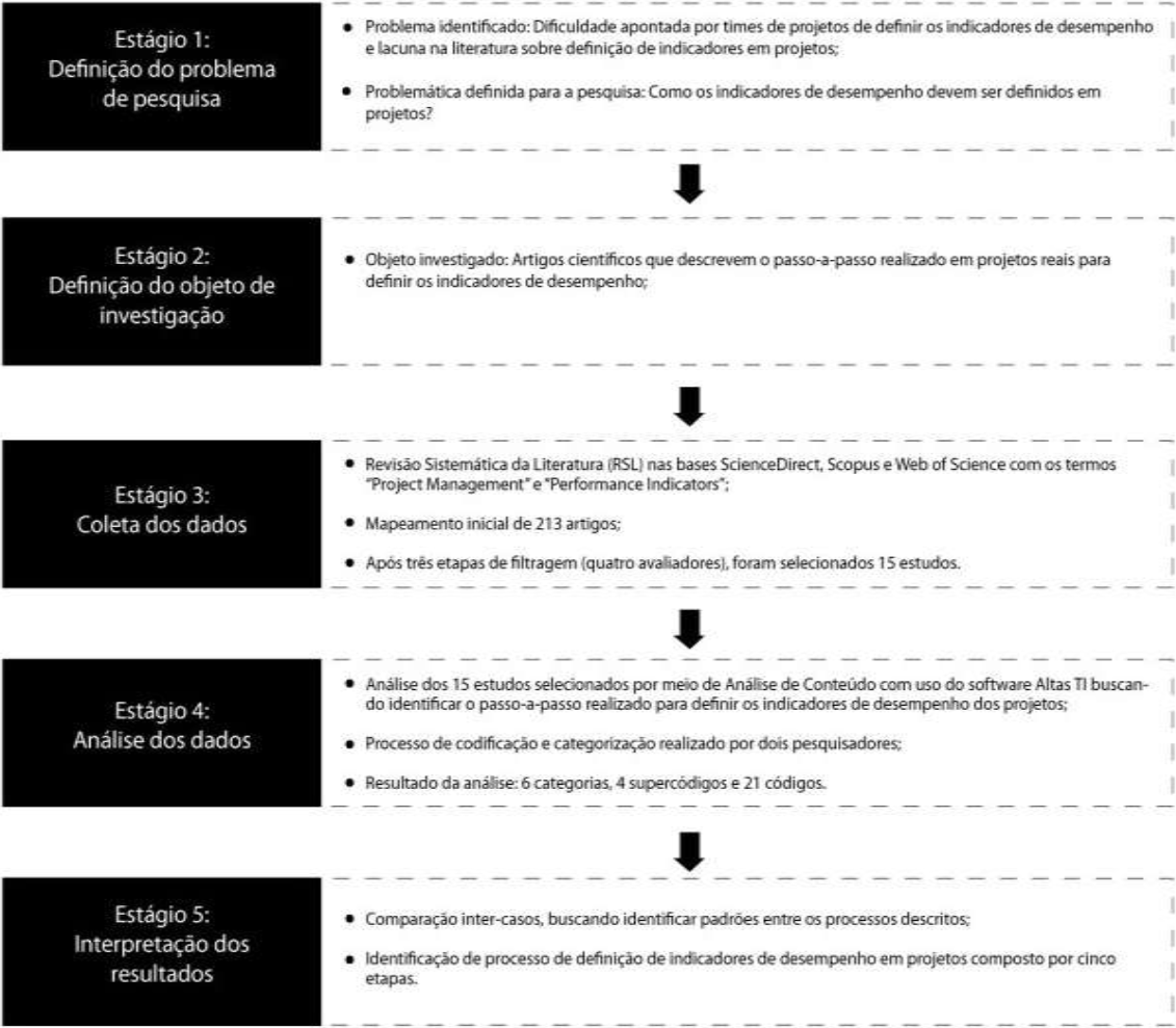 A pesquisa em questão adota uma postura exploratória para desenvolver o processo de definição de indicadores de desempenho em projetos, uma vez que é um tema pouco estudado. O objeto investigado foram as pesquisas científicas que descrevem o passo-a-passo realizado em projetos reais para definir os indicadores de desempenho. A seleção desse objeto ocorreu por três razões: a limitação de acesso a múltiplos projetos para identificar o processo desejado em campo; a riqueza de detalhes identificada em alguns estudos sobre as informações de interesse e, ainda, a validação da investigação desse tipo de objeto por outras pesquisas (Larsson, 1993; Henfridsson & Bygstad, 2013). Conforme Larsson (1993, p. 1516), “[...] estudos de casos representam um grupo fértil de achados relevantes, cujas contribuições científicas individualmente limitadas podem ser aprimoradas por meio de análises sistemáticas dos padrões entre os casos”.