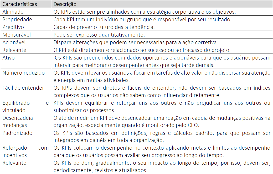 A qualidade de um indicador de desempenho pode ser definida por meio de algumas características (Kerzner, 2015; Skibniewski & Ghosh, 2009). Um bom indicador deve englobar características importantes para avaliar o avanço do projeto. As características mais utilizadas para mensurar a qualidade dos indicadores, segundo Kerzner (2015), são as da regra “SMART”, que afirma que um bom indicador é específico (Specific), mensurável (Measurable), atingível (Achievable), realista ou relevante (Relevant) e possui tempo definido (Time-bound). No entanto, as críticas atribuídas à regra SMART, têm gerado questionamentos ao seu uso. Essas críticas referemse ao fato de a SMART não indicar a ação necessária, quando sua tendência é desfavorável, por isso, a literatura tem recomendado o uso das características propostas por Eckerson (2006), por sua sofisticação (Kerzner, 2015). O Quadro 1 apresenta e descreve as 12 características propostas por Eckerson (2006).