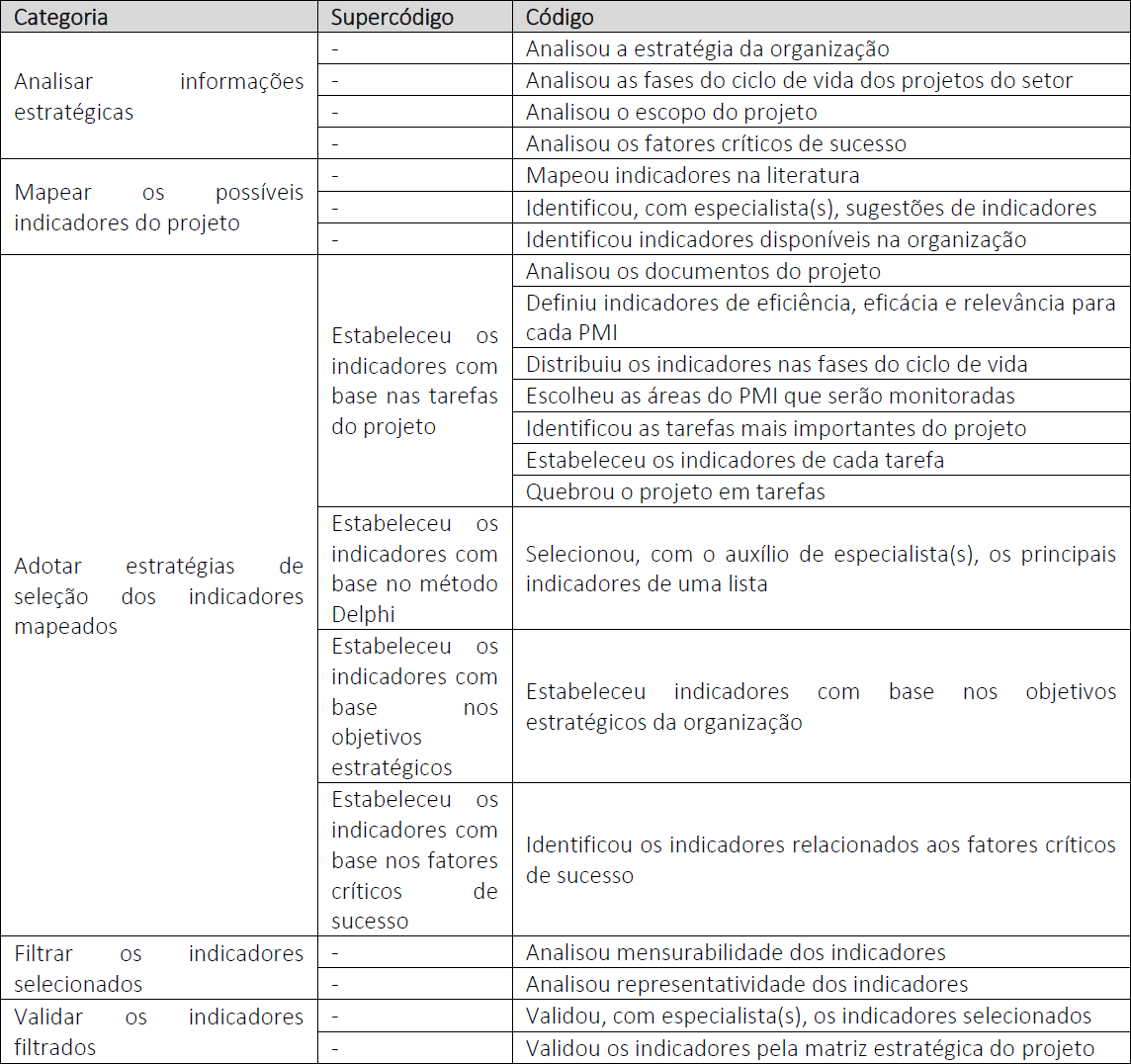 Em uma das categorias criadas (“adotar estratégias para selecionar os indicadores mapeados”) foi necessário criar quatro supercódigos (chamadas de subatividades no processo proposto) para diferenciar melhor as estratégias citadas (códigos criados) e intermediar a relação entre a categoria e os códigos. O Quadro 2 lista os 21 códigos, quatro supercódigos e cinco categorias criados nos três ciclos de codificação e apresenta as suas relações.
