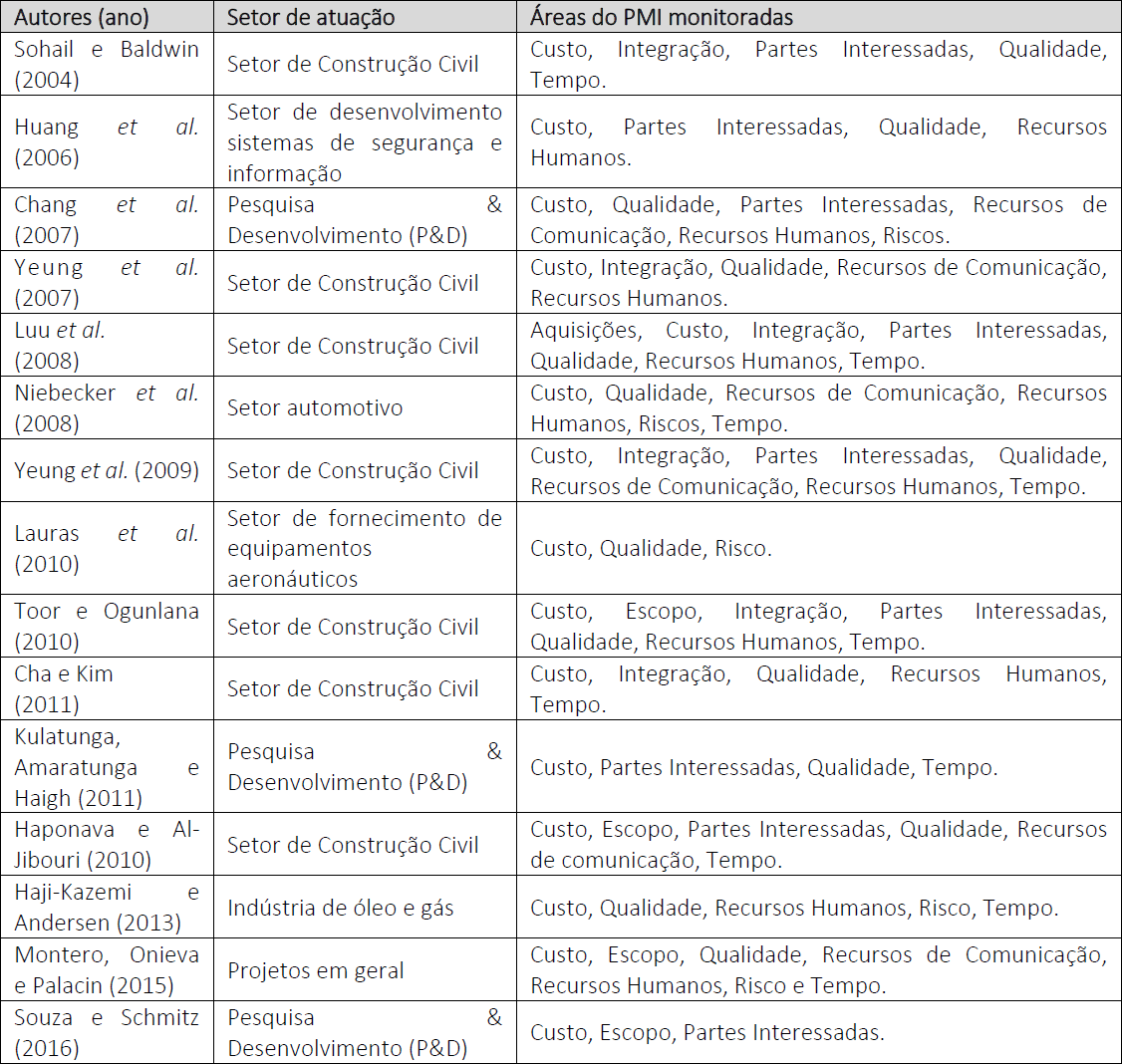O desempenho de um projeto era medido, inicialmente, pelo atendimento ao triângulo de ferro (tempo, custos e qualidade), mas, desde os anos 80, existe um consenso que esses indicadores não são suficientes para abranger todas as particularidades de cada projeto (Angus, Flett, & Bowers, 2005; Bitencourt et al., 2015; Borges & Carvalho, 2011; Carvalho et al., 2003; Kerzner, 2015). O trabalho de Haponava e Al‐Jibouri (2010) acrescenta outros indicadores, tais como: gestão das partes interessadas internas e externas, gestão da comunicação, satisfação do patrocinador, avaliação de riscos no gerenciamento do desempenho de projetos. Consequentemente, as áreas abrangidas pela gestão do desempenho devem ser as mais completas possíveis. O Project Management Body of Knowledge propõe dez áreas de conhecimento e gestão para descrever o projeto: Integração, Escopo, Tempo, Custo, Qualidade, Recursos Humanos, Comunicação, Riscos, Compras e Partes Interessadas (PMI, 2013). Nesse sentido, é necessário que os gestores desenvolvam um conjunto de Project Management Indicators (PMI) ou indicadores de gerenciamento de projetos, que abranja as particularidades de cada projeto (Angus et al., 2005, Toor & Ogunlana, 2010).