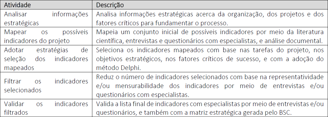 Entre as citações categorizadas na terceira atividade, foram identificadas quatro estratégias de seleção de indicadores: análise das tarefas do projeto (Haponava & Al-Jibouri, 2010; Kulatunga et al., 2011; Lauras et al., 2010; Sohail & Baldwin, 2004), análise dos objetivos estratégicos (Chang et al., 2007; Huang et al., 2006; Niebecker et al., 2008), análise dos fatores críticos de sucesso (Kulatunga et al., 2011) e método Delphi (Yeung et al., 2007; Yeung et al., 2009). Os trabalhos que citam a análise das tarefas do projeto desenvolveram as seguintes atividades para selecionar os indicadores: análise dos documentos do projeto (Sohail & Baldwin, 2004), definição de eficiência, eficácia e relevância para cada área do PMI (Lauras et al., 2010), distribuição de indicadores nas fases do ciclo de vida (Kulatunga et al., 2011), escolha das áreas do PMI monitoradas (Lauras et al., 2010), identificação das tarefas mais importantes (Haponava & Al-Jibouri, 2010), identificação dos indicadores de cada tarefa (Haponava & Al-Jibouri, 2010) e quebra do projeto em tarefas (Haponava & Al-Jibouri, 2010; Lauras et al., 2010).