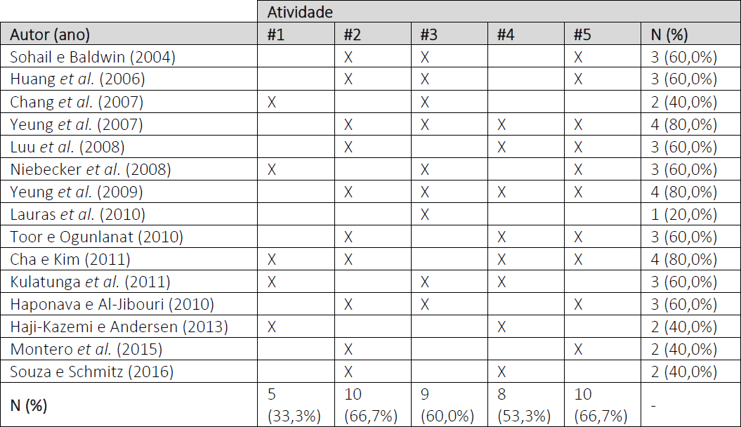 Os resultados apresentados são resumidos e constam no Quadro 5. Vale destacar que nenhum dos quinze artigos analisados realizou as cinco atividades para definir os indicadores de projetos. No geral, a quantidade de atividades desenvolvidas pelos artigos variou entre uma e quatro atividades, sendo que a maioria dos artigos analisados (sete artigos) realizou três. Essa diferença entre as quantidades de atividades está de acordo com a literatura, sinalizando que não há uma padronização entre os processos de definição de indicadores (Angus et al., 2005; Bitencourt et al., 2015; Borges & Carvalho, 2011; Carvalho et al., 2003; Kerzner, 2015). O resultado indica uma possível falha nos processos, que deveriam considerar mais informações.