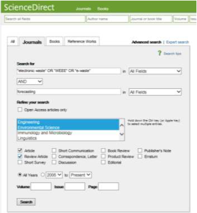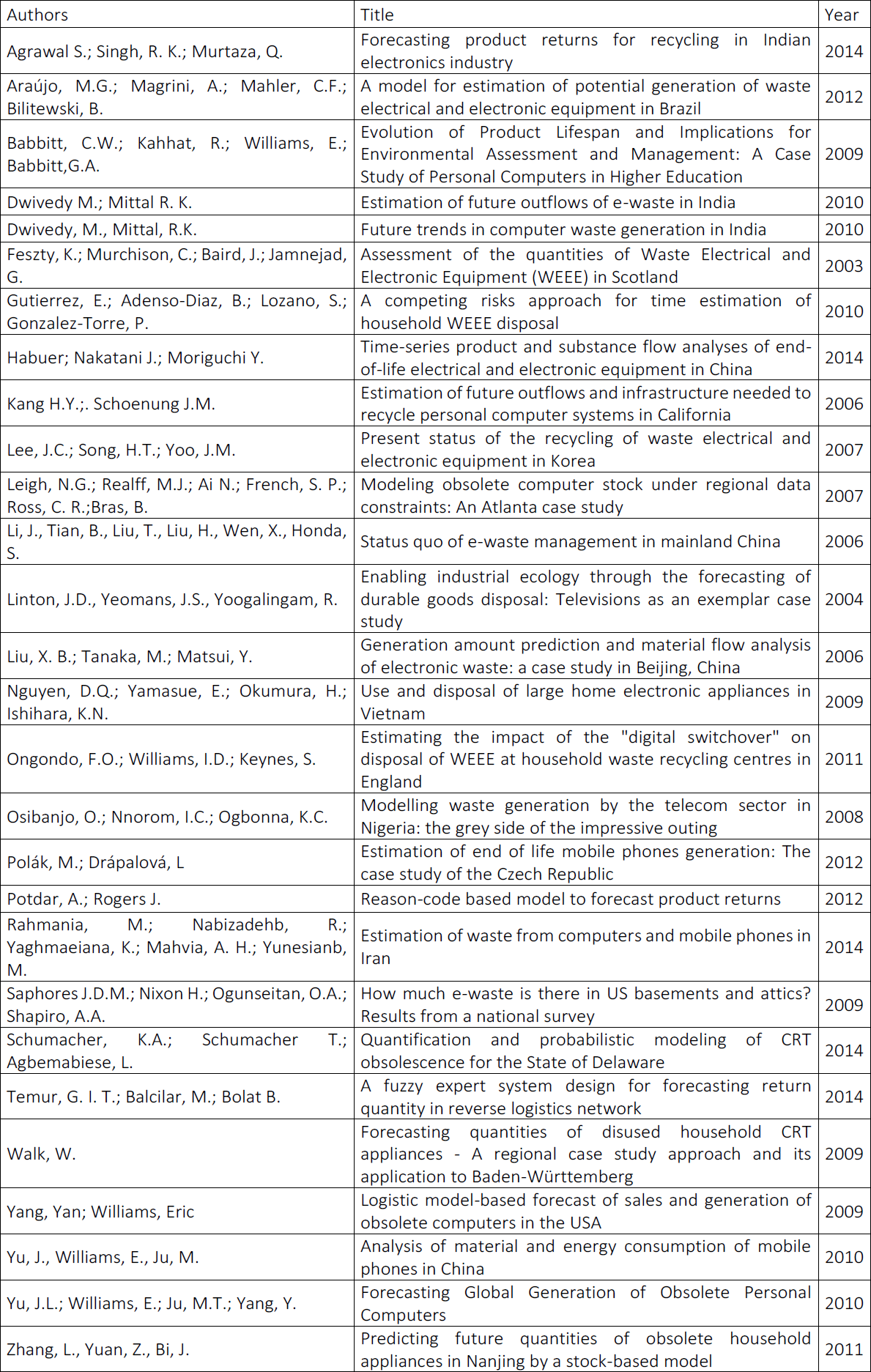 In order to answer this question, keywords related to “forecasting” and “waste electrical and electronic equipment” as well as its synonyms were chosen. The following logic was used to search in the databases: {[(“electronic waste”) OR WEEE OR (“e-waste”)] AND “forecasting”}.