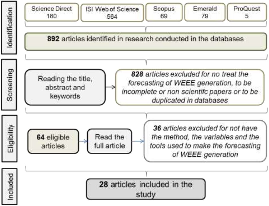Next step was to read each one of the 64 articles to identify the ones that really had a detailed description of forecasting method of WEEE´s generation and not only third-party of the results. For this reason, at this stage articles such as Forecasting product returns in closed-loop supply chains (Krapp, Nebel, & Sahamie, 2013), the ones from the Emerald database were excluded. After this analysis, 28 articles remained.
