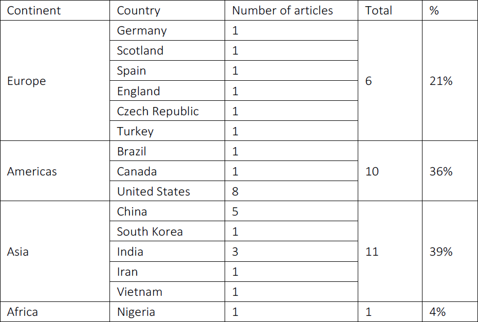 The following details were collected from the 28 articles selected for further analysis: information about the author, country where the research was conducted, journal in which the article was published, methods, tools used, variables considered in the research, and other data which were considered relevant. Tables and graphs were prepared with this information in order to enable the analysis.