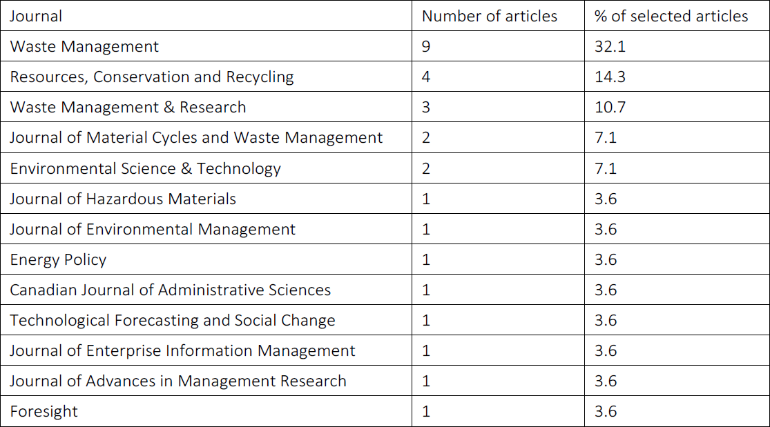 The journal in which nine of the 28 selected articles were found was Waste Management. Table 2 shows the concentration of selected articles in a few journals, with 57% of the selected papers published in three journals.