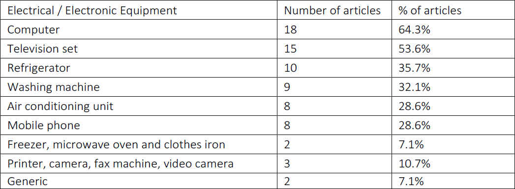The waste generated by computers that is theme in most of the papers assessed, according to this EEE was detected in residences, academic environment and companies. Television sets were also object of more than half of the articles evaluated, and some articles focused on this device due to the change from analogy to digital transmission systems that happened in some countries. Table 3 shows the number of articles for each type of equipment to which some kind of forecasting of WEEE generation was performed. Note that some articles performed forecast in relation to more than one device.