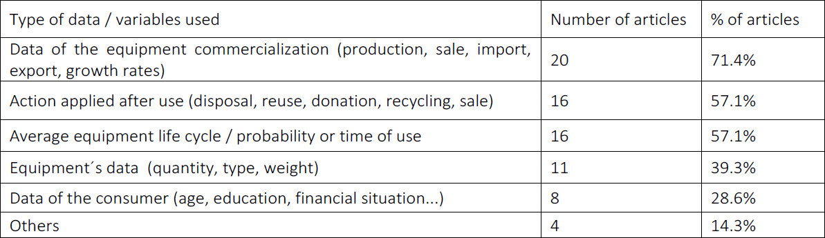 Concerning the explanatory variables used, it is possible to separate them into groups according to their similarities. The most commonly used variables were those relating to EEE commercial data, which include information about sales, production, export and import. These variables were used in 20 of the 28 articles. Data on disposal of equipment after use, such as the percentage sent to recycling or the percentage stored at home, were used in 16 articles, as well as the life cycle average of such equipment. Table 4 details these information.