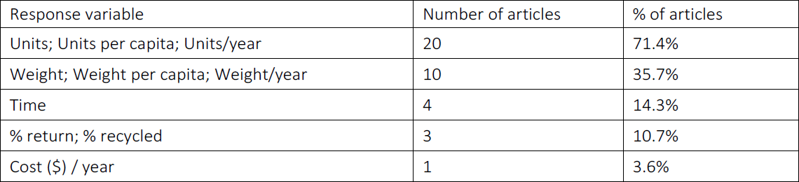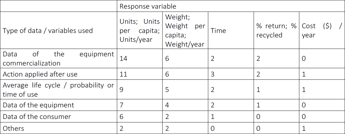 The Unit, which represents the amount of equipment no longer used and that have become waste, was the dependent variable (response) used in 18 of the 28 articles analyzed. In addition, some papers used derived units, such as Units per capita or units/year. The dependent variable Weight and its variances are important data to size these EEE´s disassembly, storage and transportation to a reverse logistics system. Table 5 presents information on the response variables grouped according to similarity. Note that some articles presented results with more than one response variable and the “Time” refers to how much time the device takes to become obsolete or be disposed.