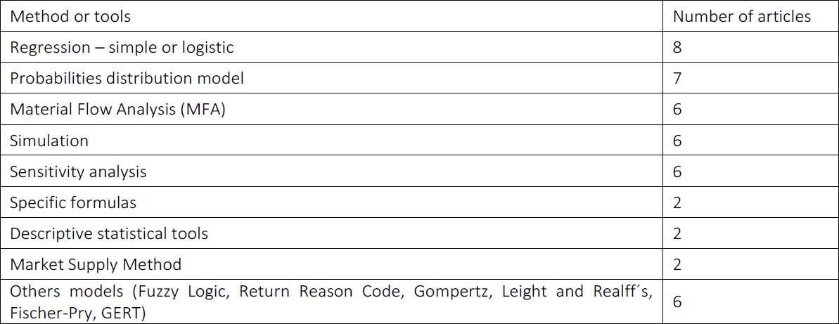 Regarding the probabilities of distribution, seven articles mentioned some probability model for waste disposal, with the Weibull distribution model being highlighted, as it was used in four articles, for example, Polák and Drápalová (2012). Sensitivity analysis was performed in six articles. Table 7 shows the number of articles by methods or tools used to forecast of WEEE generation. The total of articles are more than 28 because many articles use two or more methods or tools.
