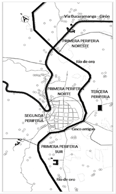 Ahora bien, las industrias debían cumplir con unos requisitos para hacerse acreedoras de los beneficios, siendo el más determinante para el desarrollo urbano de Girón, el artículo 8 del Acuerdo municipal número 001 de enero 10 de 1968: “Art. 8° Las empresas estarán obligadas a contratar personal residente en Girón en un 40% del total del personal, siendo de anotar que el porcentaje a que se hace referencia debe ser tanto más alto si se trata de personal que para ingresar a las empresas no necesita ser calificado, ya que para tener derecho a este beneficio se debe dar estricto cumplimiento a lo que aquí se establece”27. De esta forma, los nuevos habitantes no podían ser acogidos por el centro de la ciudad, cuya antigua infraestructura urbana estaba ocupada y no podía transformarse para darles cabida, debido a la protección que le otorgó la ley al incluirla dentro de la lista de Monumentos Nacionales, mediante el decreto nacional 264 de 196328. Es así como las autoridades municipales se concentraron en conservar el casco antiguo y restaurar importantes edificaciones coloniales, buscando con ello el apoyo de arquitectos e instituciones como la Corporación Nacional de Turismo29, mientras se empezaba a delimitar lo que se ha denominado las primeras periferias de la ciudad (ver la imagen 1)30.