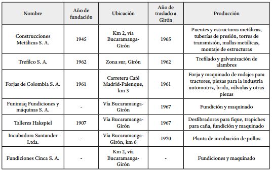 En este caso, la ciudad de San Juan de Girón no estuvo exenta de los vaivenes que trajo consigo el desarrollo urbano que vivió el país a partir de la década del sesenta. Girón se benefició de grandes proyectos liderados tanto por el sector oficial como por el privado, donde se destacan los proyectos urbanísticos de Santa Cruz y El Poblado, que abrieron las puertas a otras obras modestas pero no menos importantes, dinamizando por completo el mercado inmobiliario de la ciudad. Con ellos se buscó dar solución al problema de vivienda que empezó a evidenciar la ciudad, debido al aumento paulatino de la población24. Este aumento poblacional coincidió también con la llegada de industrias a la zona periférica de la ciudad de Girón, en especial las de tipo metalmecánico y de autopartes, como se identifica en la tabla 1.