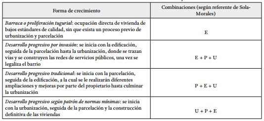 Ahora bien, en la escala barrial se identificaron los factores morfológicos y su integración funcional y/o espacial, es decir, las conexiones viales dentro del barrio y los tipos de trazados, elementos que pueden variar según el origen del barrio. Éstos, al igual que la ciudad, pueden presentar diversas formas de crecimiento, que para el caso específico de los barrios periféricos en Colombia, algunos autores han establecido en cuatro formas (ver la tabla 2).