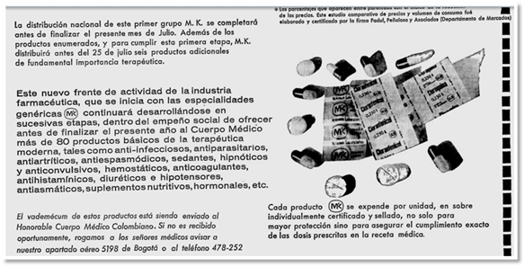 Mientras que las empresas de genéricos valorizaban su débil inversión en la publicidad, el Departamento de Marketing de MK-OFA realizaba esfuerzos considerables para captar la atención de médicos y consumidores. Si bien el anuncio de medicamentos de prescripción por fuera de las revistas dirigidas a médicos y farmacéuticos estaba prohibido por la ley (Colombia en 1920 y Estados Unidos en 1938), durante todo el siglo XX, las empresas farmacéuticas continuaron desarrollando en paralelo un marketing en la prensa popular, cuyo objeto era la consolidación de la imagen corporativa. Jeremy A. Greene y David Herzberg mostraron que, si bien no se publicitaba un medicamento en particular, sí se promocionaba el nombre de la empresa fabricante para conseguir un resultado similar en el posicionamiento de la marca19. Así, y a través de amplios anuncios en la prensa popular, MK buscó difundir las ventajas que el consumidor podría sacar de los precios y de la calidad de sus productos. Apuntaban a cultivar en el paciente el hábito de pedir al médico la prescripción del genérico y de preguntar en la farmacia por "la droga barata". Por esto, sus anuncios incluían en ciertos casos el nombre y los precios de los productos lanzados al mercado, y, en otros, realizaban un mapa de las farmacias que los vendían20.