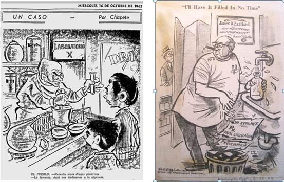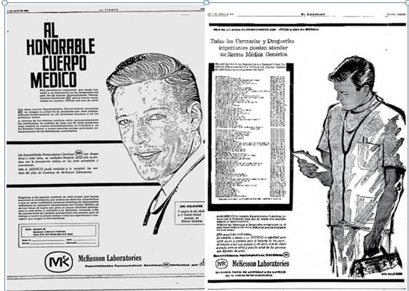 Una caricatura publicada en El Tiempo en 1963 muestra un farmacéutico-fabricante de genéricos representando un laboratorio anónimo: mientras "el pueblo" demanda productos de calidad, este sólo ofrece aquellos salidos de la "alquimia". El motivo no es muy diferente a una caricatura publicada en el Washington Post un año antes, en la cual se criticaba un proyecto que autorizaría al farmaceuta a intercambiar el medicamento originalmente prescrito por un genérico. En la caricatura, el farmacéutico no cuenta con diploma, y sus genéricos son sólo agua corriente. La fórmula médica es despedazada y lanzada a la basura, para significar cómo la intercambiabilidad del medicamento afectaba el rigor de la prescripción poniendo en riesgo la calidad de la terapéutica misma (ver la imagen 3).