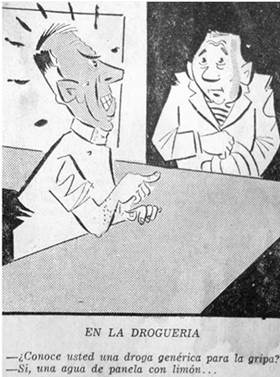 En junio de 1963, el ministro de Salud, José Félix Patiño, dicta una conferencia en la Universidad de Antioquia sobre el Plan de genéricos del Gobierno. Comienza su intervención proyectando una caricatura recientemente publicada en la prensa. En la droguería representaba un consumidor que pregunta al farmaceuta: "¿Conoce usted una droga genérica para la gripa?". A lo que responde el farmaceuta: "Sí, una agua de panela con limón..." (ver la imagen 4).