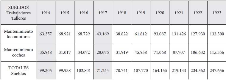 Los años presentados en este cuadro eran definidos en los estados de cuentas como terminados en 30 de junio, habiendo comenzado el 30 de junio del año anterior. Significa que los datos consignados como de "1914" corresponden a las cifras pagadas por la empresa desde el 30 de junio de 1913 al 30 de junio de 1914, es decir que son datos anteriores al estallido de la guerra. Por lo que el punto de comparación se establece con la columna correspondiente a "1917", donde se da la baja mayor en los montos, y que además es anterior al estallido de la huelga general de septiembre, cuando los números podrían distorsionarse por la cantidad de días no trabajados. La comparación de ambas columnas sugiere una baja de poco más del 28% en las cifras totales. Esa contracción podría adjudicarse a una disminución en el monto de los sueldos pagados, el despedido de personal, o, probablemente, a una combinación de ambas opciones. Lo que sugiere que es posible comprobar una tendencia significativa a la baja de los montos en libras destinados a sueldos. A partir de 1919, el incremento de las sumas correspondientes a los mismos ítems obedecía, tal como lo explicaba la propia empresa, a los aumentos otorgados en salarios (luego de la huelga de 1917, en junio de 1919 y febrero de 1920) y "a los reordenamientos derivados de las regulaciones laborales"43.