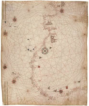 Con la expansión atlántica de las monarquías ibéricas en el siglo XV, los habitantes del Viejo Continente comenzaron a adentrarse en océanos de grandes dimensiones, más grandes de lo que probablemente alguna vez imaginaron. En ese contexto, la cartografía náutica quedó supeditada con rapidez a la navegación de altura (navegación oceánica a partir de latitudes observadas), y, en ese sentido, las cartas de marear debían servir como apoyo práctico para la gente de mar, como un instrumento náutico(11). El cambio de escala del mar Mediterráneo al océano Atlántico supuso un enorme desafío científico y tecnológico para la tradición náutica y cartográfica europea. El Atlántico se convirtió en un nuevo laboratorio de experimentación para arquitectos navales y fabricantes de instrumentos náuticos, pilotos y cartógrafos. La transición no fue una tarea fácil y demoró algún tiempo. En el proceso de adaptación de un espacio marítimo a otro, la cartografía náutica sufrió inevitablemente intensas transformaciones técnicas, de la misma manera que también se vería modificado el estatus social y profesional de sus practicantes. Al comienzo, las cartas utilizadas por los pilotos portugueses para explorar la costa atlántica de África eran similares a las cartas portolanas italianas, mallorquinas y catalanas que se habían utilizado en el Mediterráneo desde la Baja Edad Media(12). Así lo revelan las tres cartas náuticas portuguesas del siglo XV que se conservan: la carta anónima de Módena (ca. 1471), la carta del Atlántico oriental de Pedro Reinel (ca. 1492) y la carta de Jorge de Aguiar (1492) (ver la imagen 1)(13).