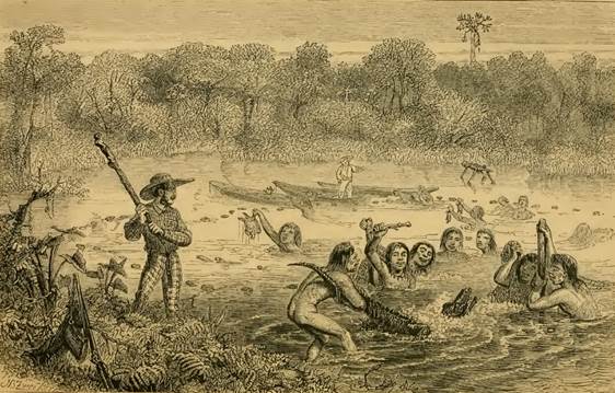 Navigating small boats through the complex mesh of Amazonian rivers, avoiding obstacles such as rocks, alligators, strong currents, floods and the much-feared phenomenon of the pororoca or tidal bore, was another area of Indian expertise. Most travellers relied on Indian crews to command the vessels they used for travel, and were often stranded when unable to procure willing Indians to participate in such travels. According to Wallace, Indians were able to navigate through the rivers “with unerring certainty, and by slight indications of broken twigs or scraped bark, goes on day by day as if travelling on a beaten road.”(63) Bates also made similar remarks on many occasions and credited the Indians as having been crucial in accomplishing the goals of his expedition.