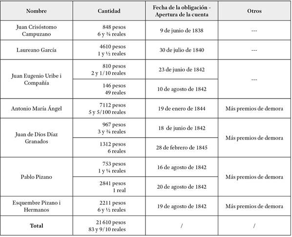 El 25 de febrero de 1845, Solomon Schloss, como jefe y socio de las casas comerciales Stiebel Brothers y S. & S. Stiebel de Kingston, se acercó al Consulado General de la República de la Nueva Granada en esa ciudad para otorgarle un poder general a sus hermanos Sigismund y Leopold “juntos o separados” para cobrar “varias acreencias” pendientes en ese país51. Nueve meses después, el 29 de noviembre de 1845, Sigismund se presentó en la Notaría 3ª de Bogotá para delegar parte de este poder en Juan Óscar Levy Daniell, otro asquenazí converso al catolicismo que ya acumulaba una década en Bogotá52, para que procediera a cobrar varios de estos créditos pendientes (ver tabla 1). Estos poderes develan que para mediados del siglo xix los vínculos entre esta familia extensa con los comerciantes granadinos eran de vieja data, implicaba varias ciudades, y, de hecho, que esta familia ya había realizado varios esfuerzos por cobrar esas “acreencias” sin mucho éxito53.