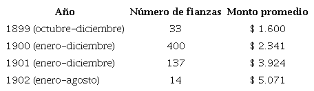 El mencionado índice de fianzas de la Alcaldía de Medellín ilustra claramente el primer patrón. Este listado contiene información, mes a mes, de los fiados, fiadores y montos comprometidos en cada una de sus 584 peticiones. Como se aprecia en la tabla 1, mientras que para 1899 el promedio de las fianzas en la capital antioqueña era de 1.600 pesos, para 1902 ya había superado los 5.000.