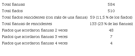 En total, se cuentan 133 anotaciones de reincidencias, correspondientes a 59 personas que solicitaron fianzas en más de una ocasión. Estas reclamaciones representaron alrededor del 23 % de todas las peticiones en la ciudad. La gran mayoría de estos casos (48) corresponde a personas que solicitaron cauciones en dos oportunidades, lo que implica que estuvieron presas al menos un par de veces. Esto fue lo ocurrido con los ya mencionados Julio M. Herrera (octubre de 1899 y mayo de 1900) y Jorge L. Uribe (febrero de 1900 y agosto de 1901). Las reincidencias mayores fueron más escasas, pero no por ello menos significativas. Siete fiados regresaron a la cárcel en al menos tres ocasiones, entre ellos el señalado Manuel A. Echavarría (mayo 1900, octubre de 1901 y enero de 1902) y cuatro personas más lo hicieron en al menos cuatro ocasiones.