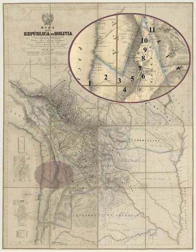 Ondarza, Juan. Mapa de la Republica de Bolivia mandado publicar pr el Gobierno de la Nacion en la Administracion del Presidente Doctor José Maria Linares... / Levantado y organindo en los años de 1842 à 1859 Por el Teniente Coronel Juan Ondarza, Comandante Juan Mariano Mujia y Mayor Lucio Camacho Ondarza, 1859, http://gallica.bnf.fr/ark:/12148/btv1b530327940/f1.item