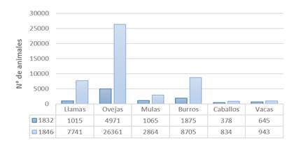 Calama se convirtió hacia mitad de siglo en uno de los principales proveedores de ganado vacuno y lanar de Cobija55. A esta última también llegaban mercancías y animales desde el noroeste argentino y -a la inversa- miles de animales de carga se aprestaban en Atacama para la internación y distribución de los efectos mercantiles que ingresaban por Cobija. En sincronía con la dinamización del comercio y con las mejoras impulsadas, para el período 1832-1846 se nota un considerable incremento ganadero (ver figura 1). Las ovejas fueron las protagonistas (430 %), cuestión que se podría relacionar con el aumento de tierras de pastaje industrial, con el comercio de lanas y con el consumo de los nuevos habitantes. Centrándonos en los animales de transporte, los burros se incrementaron un 364 % y las mulas, un 168 %56. Desconocemos las razones del aumento de auquénidos, aunque podría asociarse con la explotación de su carne, lana y piel, así como también con la pervivencia de su uso como animales de carga en zonas altas.