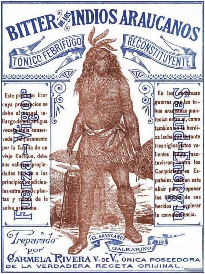 Displaying the picture of a strong indio, naked except for a loincloth, opulent jewelry, and feathers, the brand underlines the image of the heroic araucano of a pre-independence glorious past.43 Although he stands there with his hands cut off (the axe leans in the background), which, according to Stuchlik, underscores the image of the bloodthirsty indigenous man in the nineteenth century,44 his gaze is determined and clear. Consumers are drawn to this heroic past with lettering on both sides of the painting that tells of the three-hundred-year struggle against the Spaniards. These inscriptions promise the buyers of this bitter power and recovery, which lies dormant in the secret of the ancient recipe:
