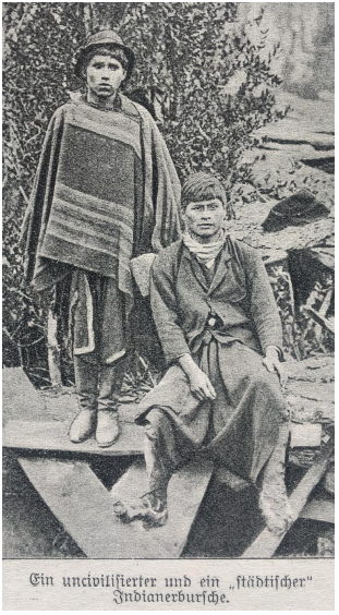 Much like Guevara, the author portrayed the indigenous population as strong, proud, and free people who had been “protected” for centuries by nature;86 all of this was about to disappear by alcohol, among other things. Only a few months later, in February 1905, Father Sigifredo wrote two letters to Luis González, federal prosecutor in Valdivia, and to Secretary Ludovico Barra, denouncing the deceitful businesses of Guillermo Angermeyer, a colonist of German descent, with indigenous people who were given liquor in return for giving up their lands. “Usually, it is vagabond Indians who sell the rights they have to a property,” wrote the missionary. Well-connected to federal actors of the region, he made a difference between those che who were in the mission’s charge-the “good” ones-and those who were negotiating with Angermeyer for alcohol.87 Especially, the urban zones and cities on the frontier, such as Valdivia, Osorno, Puerto Montt, and the fast-growing Temuco, with their great number of liquor stores were declared to have a dreadful impact on indigenous culture. For example, Burcardo de Röttingen, prefect of the Capuchin mission, wrote that there were always che in Valdivia because of legal proceedings at court about their lands: “They roamed the streets, usually staying overnight in the liquor stalls, where, of course, they got intoxicated. They did not know where to spend the night. To remedy this, I decided to build a simple house in the garden, where they would not disturb us.”88 Apart from letters, chronicles, reports, and their own periodicals, the Capuchin missionaries also used photographs to document life on the frontier. Similar to the way ethnographers put on stage indigenous culture, they published a photograph taken by B. Hermann of two young indigenous men; one was described as “uncivilized,” while the other one was characterized as “urbanized” (see Figure 2).89
