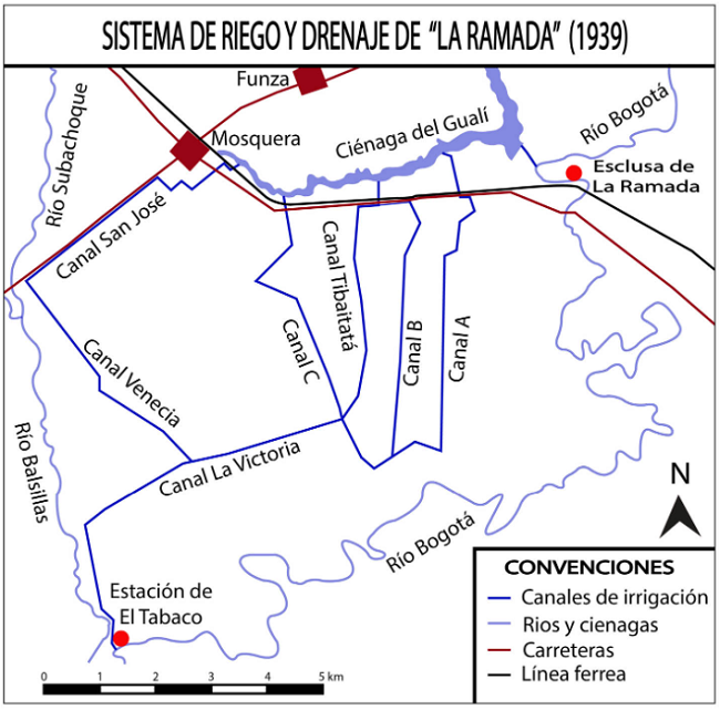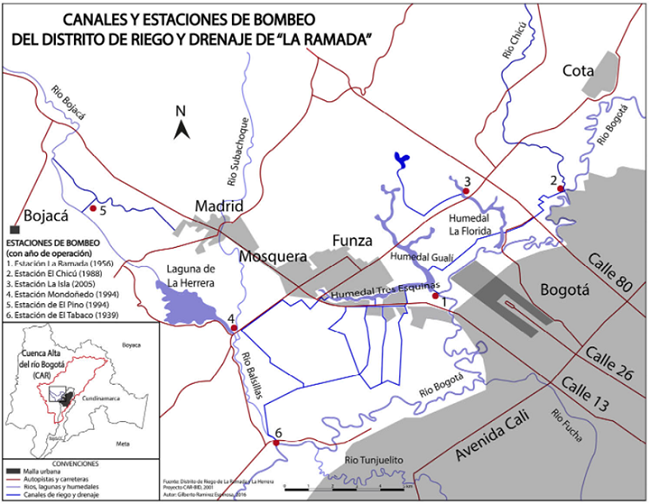 Por eso, este artículo se propone reseñar las razones y motivaciones que llevaron a construir el complejo de canales, compuertas y estaciones de bombeo que constituyen el distrito de riego y drenaje de La Ramada, y su correspondiente contribución en la transformación de los usos de los recursos hídricos de la cuenca del río Bogotá. Se presentan dos partes: la primera cubre el periodo en el que fueron construidas las principales obras de ingeniería hidráulica que dan origen al distrito de riego de La Ramada y son definidos los responsables de la operación de este dentro de una política estatal cada vez más definida y específica de la explotación del recurso hídrico en la Sabana de Bogotá, en particular, y de Colombia, en general; la segunda parte cubre el periodo en el que el distrito de riego de La Ramada pasa a manos de la Corporación Autónoma Regional de la Sabana de Bogotá y Valle de Ubaté y Chiquinquirá (en adelante, car), entidad pública a la cual pertenece aún hoy día el distrito de riego de La Ramada y por la cual ha sido integrado dentro de una estrategia más amplia de un uso coordinado de todas las aguas de la cuenca del río Bogotá. Se concluye, finalmente, con una reflexión acerca de la importancia de estudiar las políticas modernas de irrigación en Colombia desde la historia ambiental. Así, el artículo tiene como propósito profundizar en la comprensión de los retos que supone, para las ciudades modernas, el uso del recurso hídrico para sus múltiples necesidades y las tensiones y conflictos que esto implica.