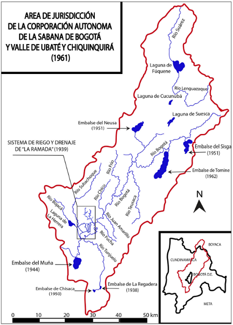 La regulación sobre las obras de La Ramada y la desecación de los pantanos de Fúquene no era sino una parte de la gestión conjunta que la Comisión ejercía sobre la Sabana de Bogotá y el valle de Ubaté y Chiquinquirá, jurisdicción sobre la que ya empezaba a proyectar la conexión de ambas cuencas por intermediación de obras, como las del embalse de Tominé40 (véase mapa 3). Las bases para una administración regional sobre la Sabana de Bogotá estaban creadas.
