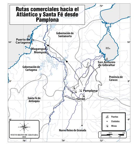 La evasión fiscal en los metales tiene para Pamplona varias explicaciones, entre las cuales algunas ofrecen similitudes a lo ocurrido en otras latitudes de la América española. La principal quizá esté en los altos precios ofrecidos por comerciantes que llevaban su oro hacia países como Holanda, Francia e Inglaterra, o que lo comercializaban en mercados del Asia. Al respecto, algunos testigos interrogados por el visitador fiscal Pedro de Urbina en el año 1678, afirmaron que los comerciantes compraban el oro a precios muy superiores a los autorizados por la Corona. A la par, describieron las rutas utilizadas: desde Pamplona, el oro viajaba por caminos hacia los ríos Sogamoso, Lebrija, Magdalena, Zulia (Mapa 1), que conducían a los puertos del mar Caribe: Mompox, Magangué, Cartagena de Indias, San Antonio de Gibraltar. Allí se negociaba con mercaderes autorizados y con negociantes de barcos “averiados” o “navíos de permisión”, las conocidas “arribadas maliciosas” que pululaban en los puertos. Los comerciantes también llegaban a los reales de minas con la venia de los alcaldes de minas y recorrían los lavaderos rescatando el oro. Ahora, no todo el oro partía hacia los puertos del Caribe. Tanto Cornejo como Urbina observaron que parte de este se llevaba a Santa Fe de Bogotá para cubrir adelantos de plata, invertir o, sencillamente, para amonedarlo. De estas visitas fiscales, igualmente, puede inferirse que parte del metal no declarado nutría economías regionales, y se sabe que en la segunda mitad del siglo XVII crecieron las haciendas cacaoteras del Valle de Cúcuta y Mérida, sobre cuya expansión bien podría interrogarse la muy probable participación de mineros de Pamplona91.